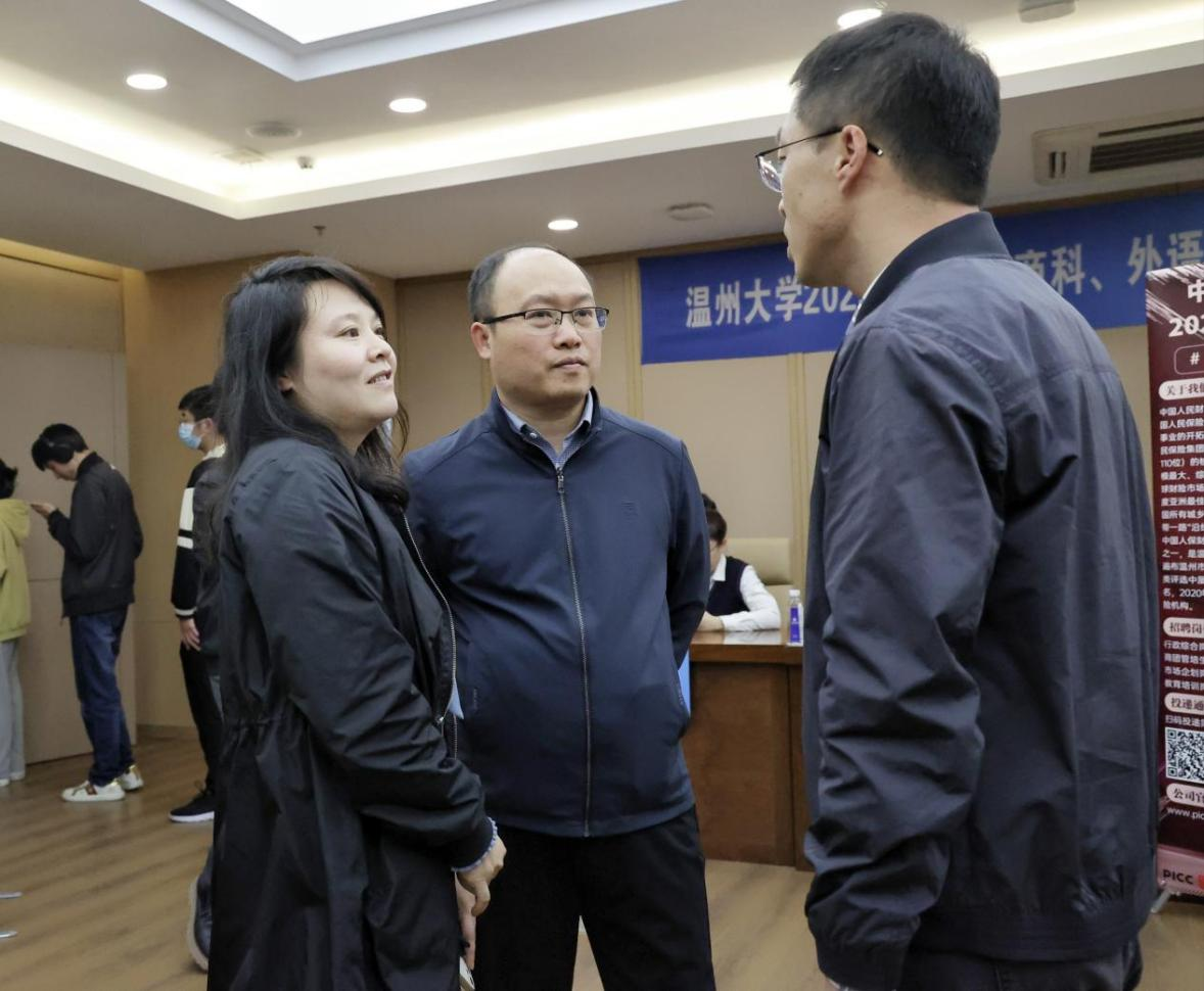 招聘会当天,温州大学招生与就业处副处长魏晓晓、新葡萄8883官网AMG党委副书记唐华、人文学院党委副书记魏一、外国语学院党委副书记陈勃、温州大学招生与就业处就业服务科科长朱雪雷以及各学院就业辅导员来到现场了解情况,重点调研企业人才需求和招聘实况,会场上人头攒动,井然有序,气氛热烈。