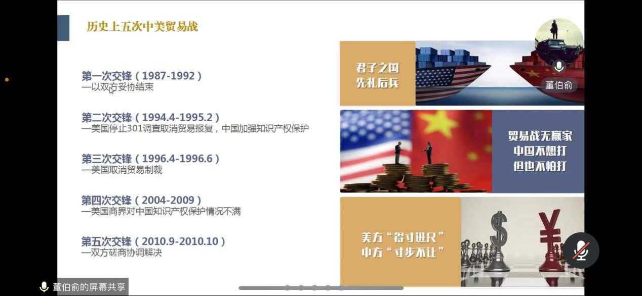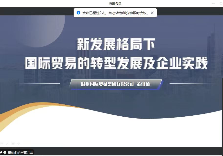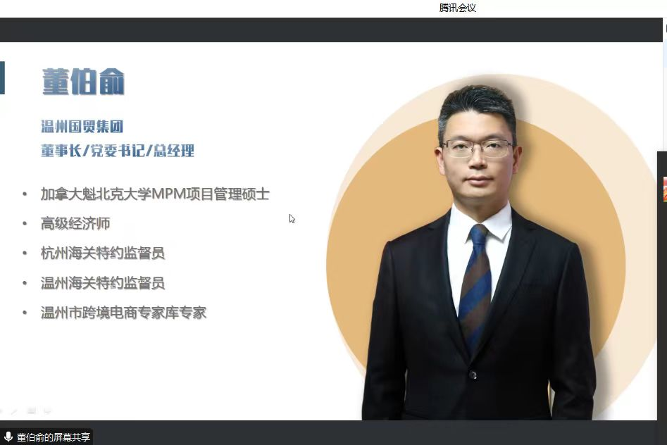 为进一步加深国贸专业同学对国际经济与贸易专业的理解,让专业知识学习能够更好地结合实践需要,新葡萄8883官网AMG国贸系于2023年6月19日下午邀请温州国贸集团的董事长董伯俞先生,为22级国贸本科同学开展主题为“新发展格局下国际贸易的转型发展及企业实践”的专题讲座。本次讲座虽然是以腾讯会议线上的方式进行,但同学们按时热情参加、认真学习和记录,使本场讲座得到圆满成功。