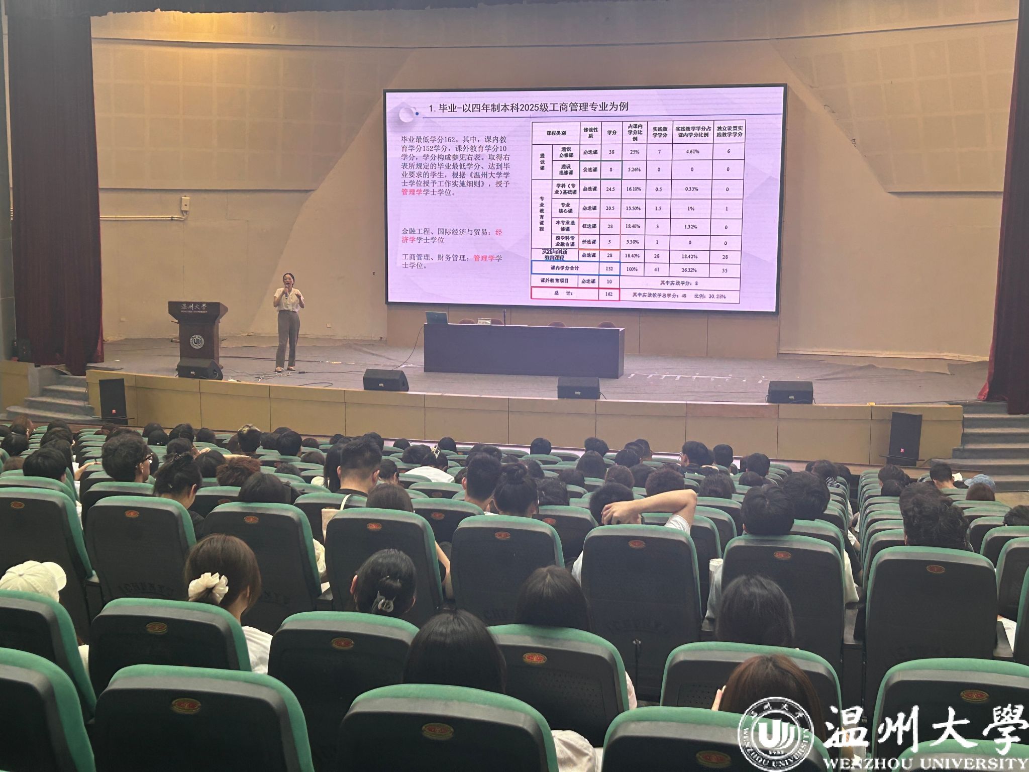 9月12日下午,温州大学我院2025级本科新生始业教育在南校区报告厅举行。教学科叶熹僖老师为465名新生带来一场干货满满的学籍政策解读。