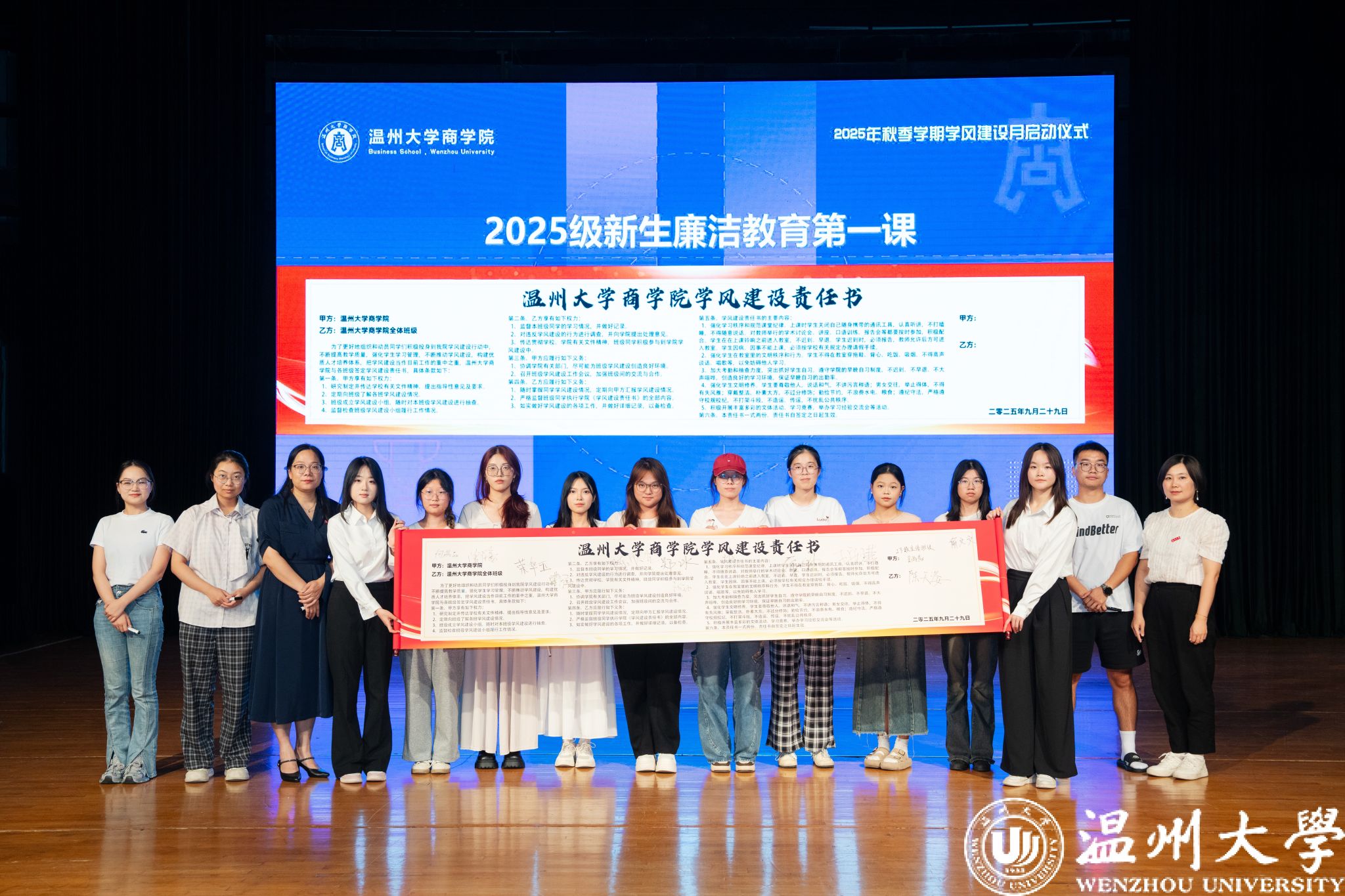 最后,曾蓓蕾副书记针对新生讲述了廉洁教育第一课,随后仪式进入 “创优良学风责任书签订仪式” 环节。各班级代表依次上台,与学院签订创优良学风责任书。责任书的签订,不仅明确了各班级在学风建设中的责任与目标,更凝聚了全体商院人共建优良学风的决心。