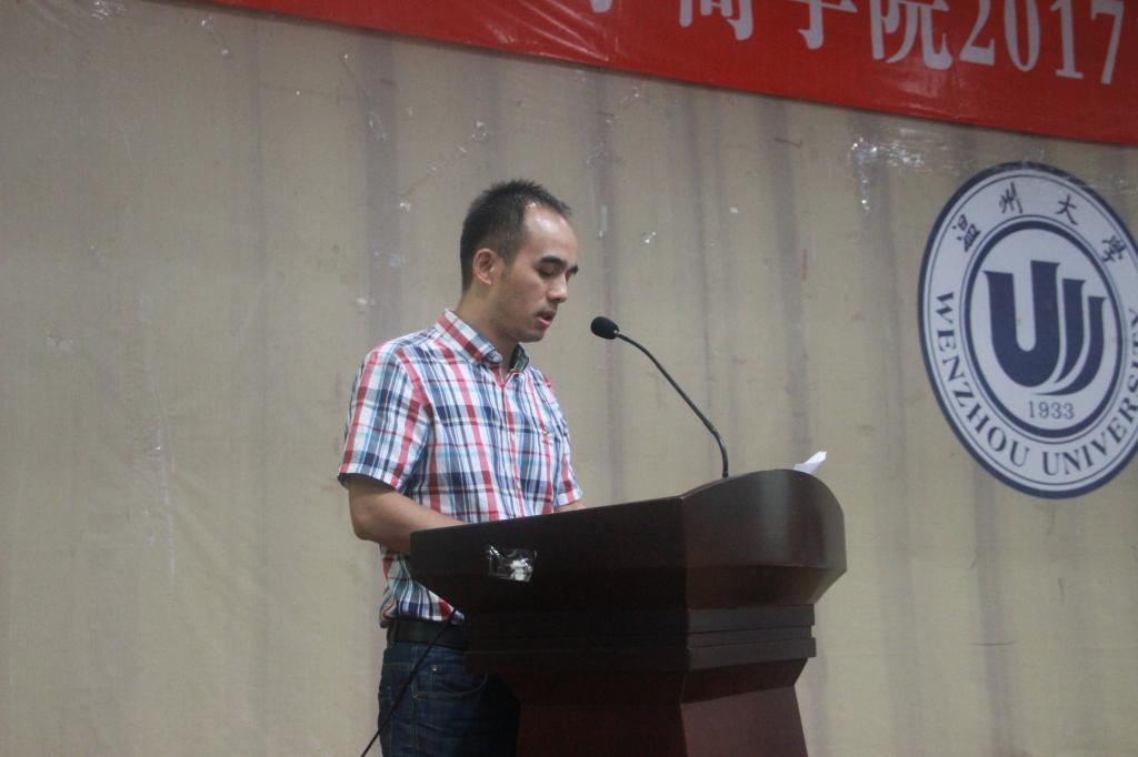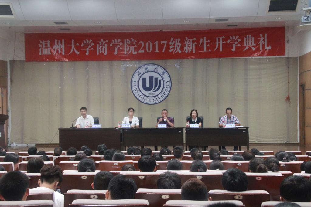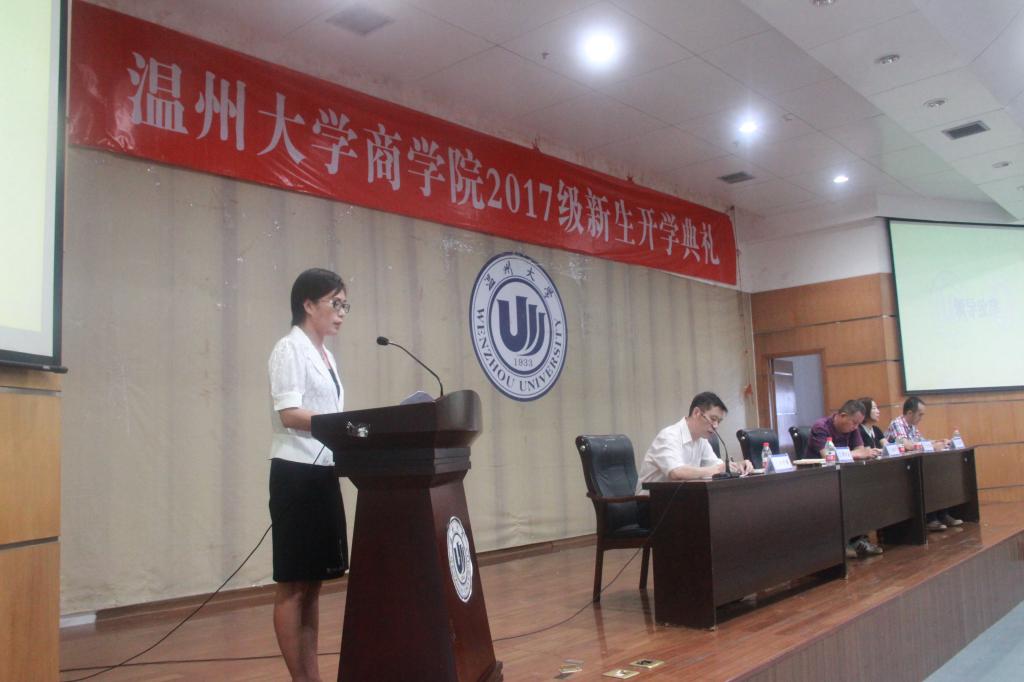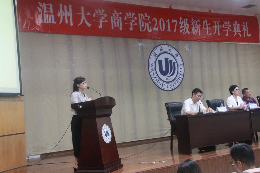 庄严肃穆的国歌声拉开温州大学我院2017级新生开学典礼的帷幕。郑彩莲书记在致辞中代表学院向17级新生的到来表示衷心的祝贺和诚挚的欢迎。郑书记围绕“概率与你”的主题,向新生提出“提高大学期间成才的概率、提高大学期间善于交往的概率、提高大学期间强身健体的概率、提高大学期间自我保护的概率”四方面的期望。她以17届优秀毕业生13金融工程班的朱圆缘同学为例,鼓励新生多与牛人交往,她认为交往是一种能力,善于交往更是一种智慧,要在交往中提升自己的格局;郑书记还以我院优秀校友王仲辉先生为例,建议新生及时明确目标,并付诸行动坚定前行。