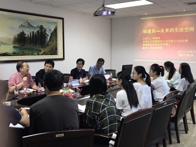 2017年10月12日,应我院邀请,何秉欣一行造访温大,我院党总支书记郑彩莲、副书记刘开练、院长助理王洪斌出席了讲座活动,温州大学外事处处长严晓鹏,温大首席心理咨询师张海音等陪同参加了讲座活动,何博士在新葡萄8883官网AMG222会议室为研究生师生做了一场名为《绿建筑——未来的生活空间》的主题演讲。何秉欣先生是著名慈善家何朝育之孙、英国政经学院经济学博士、温州大学客座教授、台湾正大纤维股份工业有限公司总经理。
