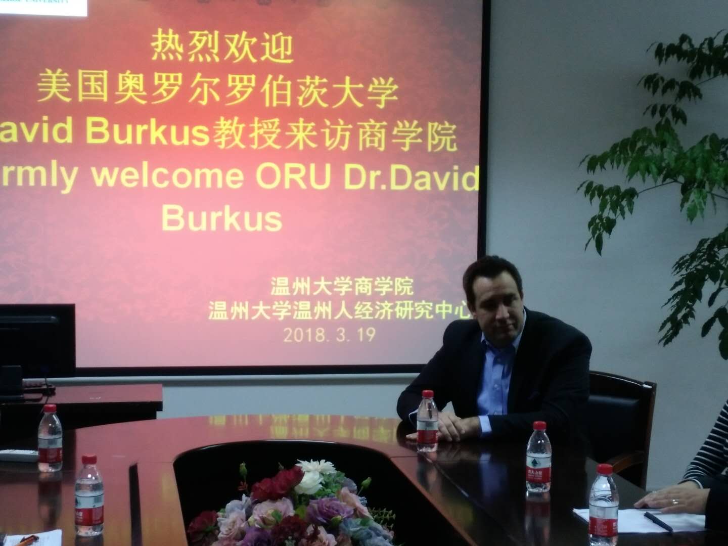 2018年3月19日,TED演讲者,美国ORU(Oral Robert University)大学David Burkus教授及其夫人,来到温大新葡萄8883官网AMG作学术讲座和交流。新葡萄8883官网AMG院长胡振华教授热情接待了David夫妇。新葡萄8883官网AMG副院长罗建利、林俐等其他领导和相关学科教授,以及温州大学温州人经济研究中心相关领导,新葡萄8883官网AMG的研究生及本科生同学等参加了本次交流活动。
