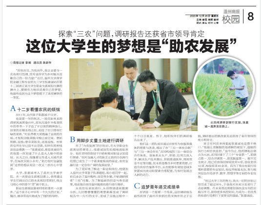 为了更好地了解这一职业和岗位,他便加入温州大学菜篮子队课题组,和小组同学一起,前后走访了温州梅屿、丽岙等乡镇,开始调研探索“三农”问题。为了解最新的信息与务实政策,他还独自前往温州瓯海农商行进行调研。