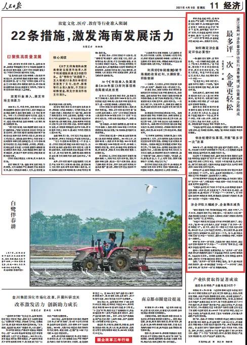 4月9日,《人民日报》在经济版面刊登了《最多评一次,企业更轻松》一文,文中聚焦了温州“最多评一次”改革的成效和优势。