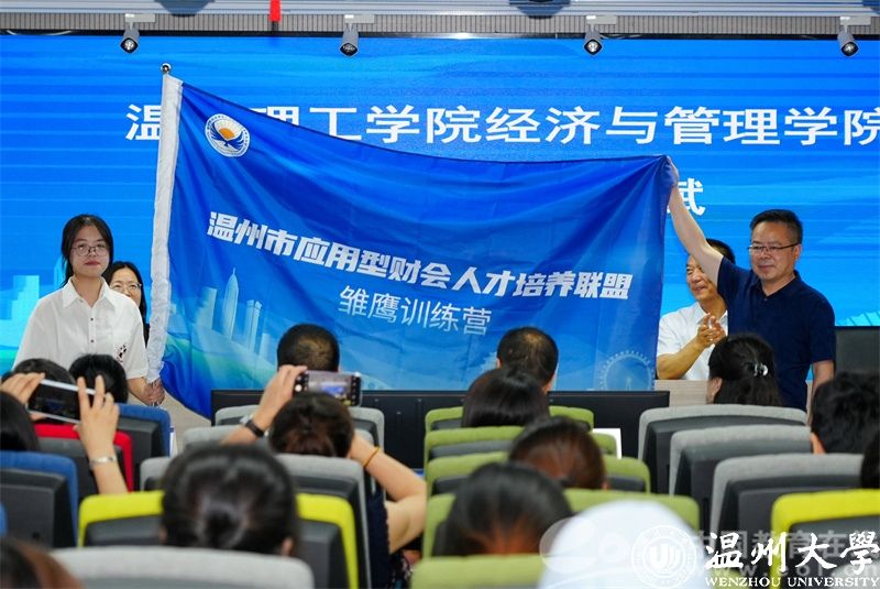 授旗环节将气氛推向高潮。温州理工学院经管学院党委书记朱斌将营旗授予学员代表郑乐乐,象征“雏鹰”使命的传承。