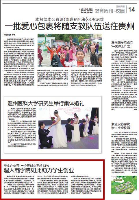 正值毕业季,温州大学 我院2014届市场营销应届毕业班52名同学 中,有7名同学在毕业前创立了自己的公司。按 这样的数据计算,该专业的创业率超过了13%。 “我们班在大一的时候就在老师、班助带 领下搞了一个特色班,班级按照公司形式来管 理,比如董事长、总经理来分干部,这样一来, 大家对创业有比较大的兴趣。”创业代表马谦 诚这样说。他的同班同学祁汉锋,在大学期间 也找到了自己的创业方向——经营绍兴黄酒, 更被其他同学戏称为“绍兴黄酒唯一的希望”。 在我院,不仅仅是基础设施配 备完善,学生们更有足够的时间与空间去实施 自己脑袋中的计划。各种各样的创业讲座帮 助他们以最快最有效的方式了解创业,包括创 业中遇到种种问题的解决方法,如何在大学四 年内找到最适合自己的创业方向等。老师与 学生,学生与学生之间频繁互动,渐渐形成了 一种良好的知识循环体系。 除此之外,新葡萄8883官网AMG还设立了专门的创业空 间提供给想要创业的学生无偿使用。经常能 看到,在晚自习的时候,创业空间的灯大亮着, 总会有不同的学生在里面讨论问题,不用走近 就能感受到浓浓的创业激情。由于担心学生 仍然不能很好地与社会创业对接,学院不仅对 内成立了就业部和创业部,还特地聘请校外的 创业导师给学生们做指导工作。