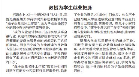 招聘会上,有一个展位格外引人注目,那 就是由我院郑彩莲教授领衔的 “莲子生涯名师工作室”,正为毕业生提供专 业的职业咨询与应聘简历指导。