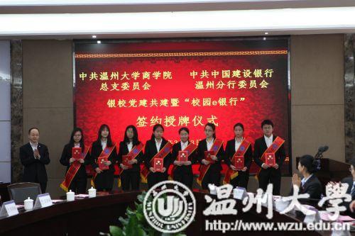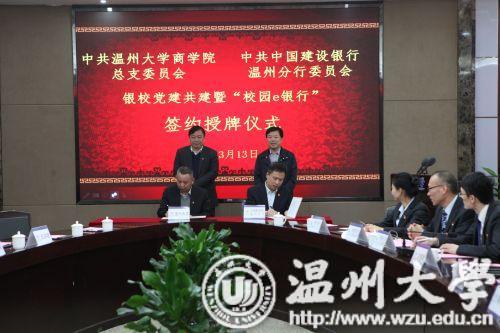 3月13日下午,建设银行温州分行与我院举行银校共建暨“校园e银行”签约授牌仪式。温州大学校长赵敏、建设银行浙江省分行副行长陈根海出席仪式并分别致辞。建设银行浙江省分行、温州分行和温州大学有关负责人及师生代表参加了签约授牌仪式。根据签约协议,共建双方将党建工作建立在银校合作项目上,创建国有银行、瓯越名校党建共建品牌。