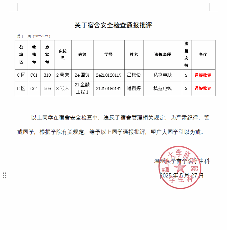 根据学校学生公寓安全“四级联查”工作机制要求,学工部、研工部、公管处、保卫部、资产公司等部门协同于5月21日对学生公寓区安全情况进行检查,我院以下同学在宿舍安全检查中,违反了宿舍管理相关规定,给予通报批评处分,通报如下: