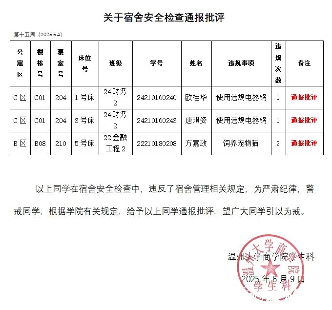 根据学校学生公寓安全“四级联查”工作机制要求,学工部、研工部、公管处、保卫部、资产公司等部门协同于6月4日对学生公寓区安全情况进行检查,我院以下同学在宿舍安全检查中,违反了宿舍管理相关规定,给予通报批评处分,通报如下: